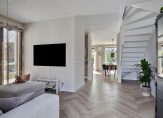 Ruime, lichte woonkamer aan de voorzijde met PVC-vloer, stucwerk wandafwerking en openslaande deuren naar de voortuin. De trapopgang naar de eerste verdieping bevindt zich centraal in de woonkamer.