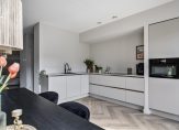 De uitgebouwde woonkeuken aan de achterzijde is voorzien van een PVC-vloer, deels stucwerk- en deels behangwandafwerking, en een deur naar de achtertuin.