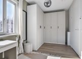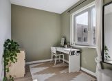Slaapkamer 2 (achterzijde) met PVC-vloer, stucwerk wandafwerking en een kastenwand (ter overname).