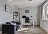 Slaapkamer 4 (voorzijde) met laminaatvloer, stucwerk wandafwerking en Frans balkon.