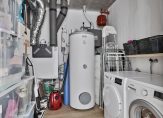 Was-/technische ruimte met laminaatvloer. Hier bevinden zich de aansluitingen voor de wasapparatuur, het warmte-terugwinsysteem, de elektrische boiler en de warmtepomp.