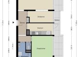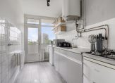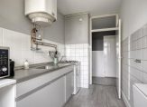 Hal met laminaat vloer, stucwerk wandafwerking meterkast (4 groepen en 2 aardlekschakelaars). Intercom met video functie. Lichte woonkamer met laminaat vloer, stucwerk wandafwerking, inbouwkast en deur naar het balkon. Eetkamer (voorheen slaapkamer 2) met laminaatvloer. Dichte keuken met laminaat vloer en deur naar het balkon. Eenvoudig keukenblok en losse apparatuur (deels ter overname). Elektrische boiler, Daalderop (2014).