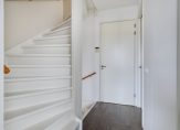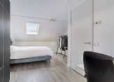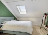 Overloop met tegelvloer en stucwerk wanden. Riante, 4e slaapkamer met tegelvloer, stucwerk wanden, Velux dakraam aan de achterzijde, opbergruimte achter knieschot en een luik met vlizotrap. Luxe 2e badkamer (2018) met dubbele wastafel met meubel, inloopdouche, hangcloset en mechanische ventilatie.