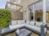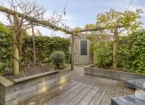Keurig aangelegde, onderhoudsvriendelijke achtertuin gelegen op het noord-westen met terras met sfeervolle verlichting, borders, buitenkraantje en achterom. Houten berging voorzien van elektra.