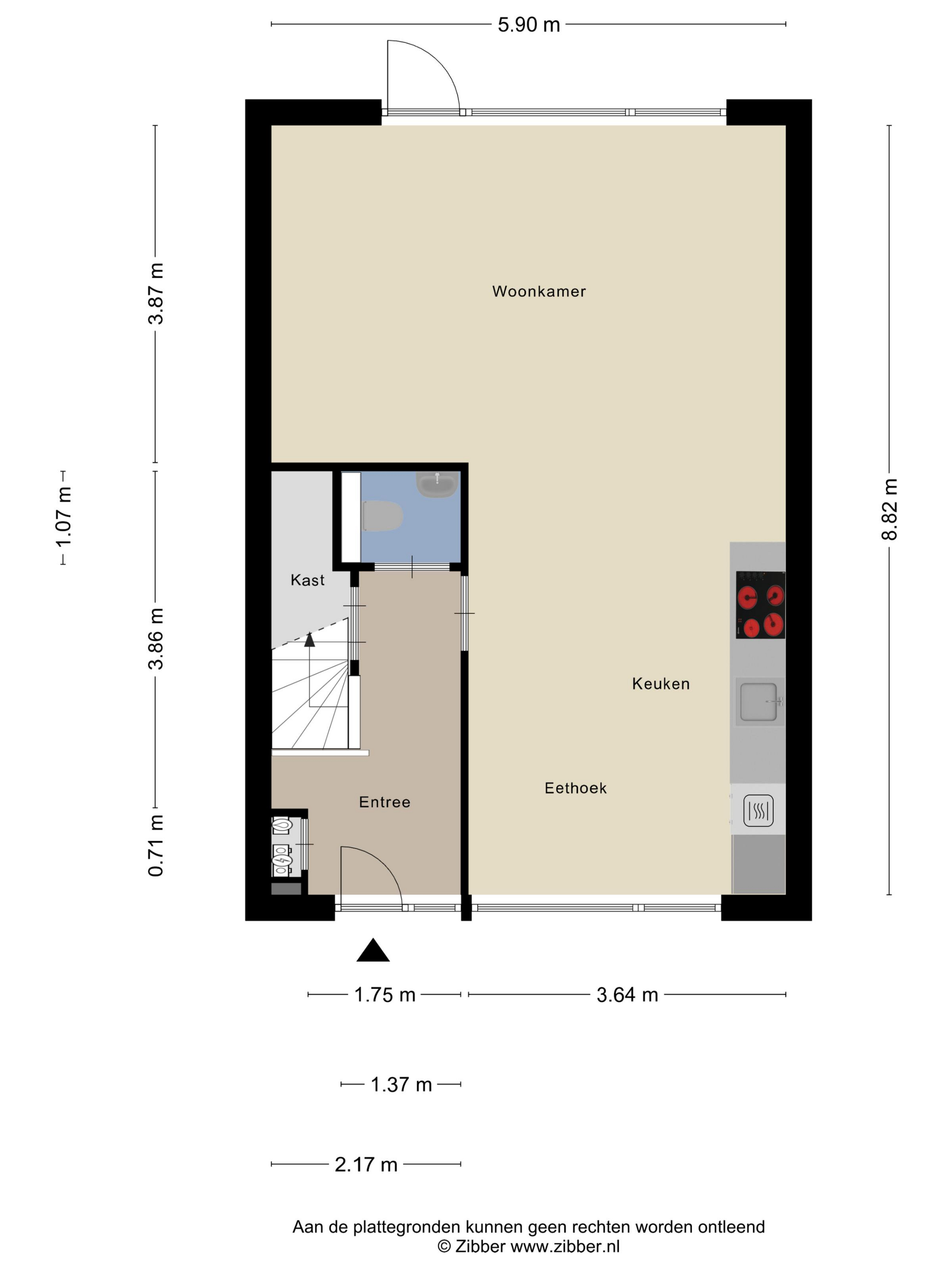 De gehele begane grond is voorzien van een gietvloer met vloerverwarming en stucwerk wandafwerking. In de hal bevindt zich een praktische zeer diepe trapkast en de meterkast met 9 groepen, 3 aardlekschakelaars en glasvezelaansluiting. Vanuit de hal is er toegang tot de woonkamer met open keuken, het toilet en de trap naar de eerste verdieping. He toilet is ruim deels betegeld en voorzien van hangcloset, fonteintje en afzuiging.