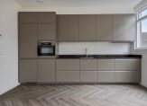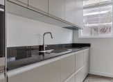 Open keuken aan de achterzijde met PVC vloer en deur naar de achtertuin. De moderne en rechte keuken opstelling is voorzien een granieten werkblad van verschillende inbouwapparatuur; 4-pits inductie kookplaat, afzuigkap, oven, koelkast, vriezer, vaatwasser en verschillende opbergkastjes en lades.
