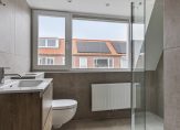 Volledig betegelde, luxe badkamer aan de voorzijde met wastafel met meubel, hangcloset, inloopdouche en mechanische ventilatie.