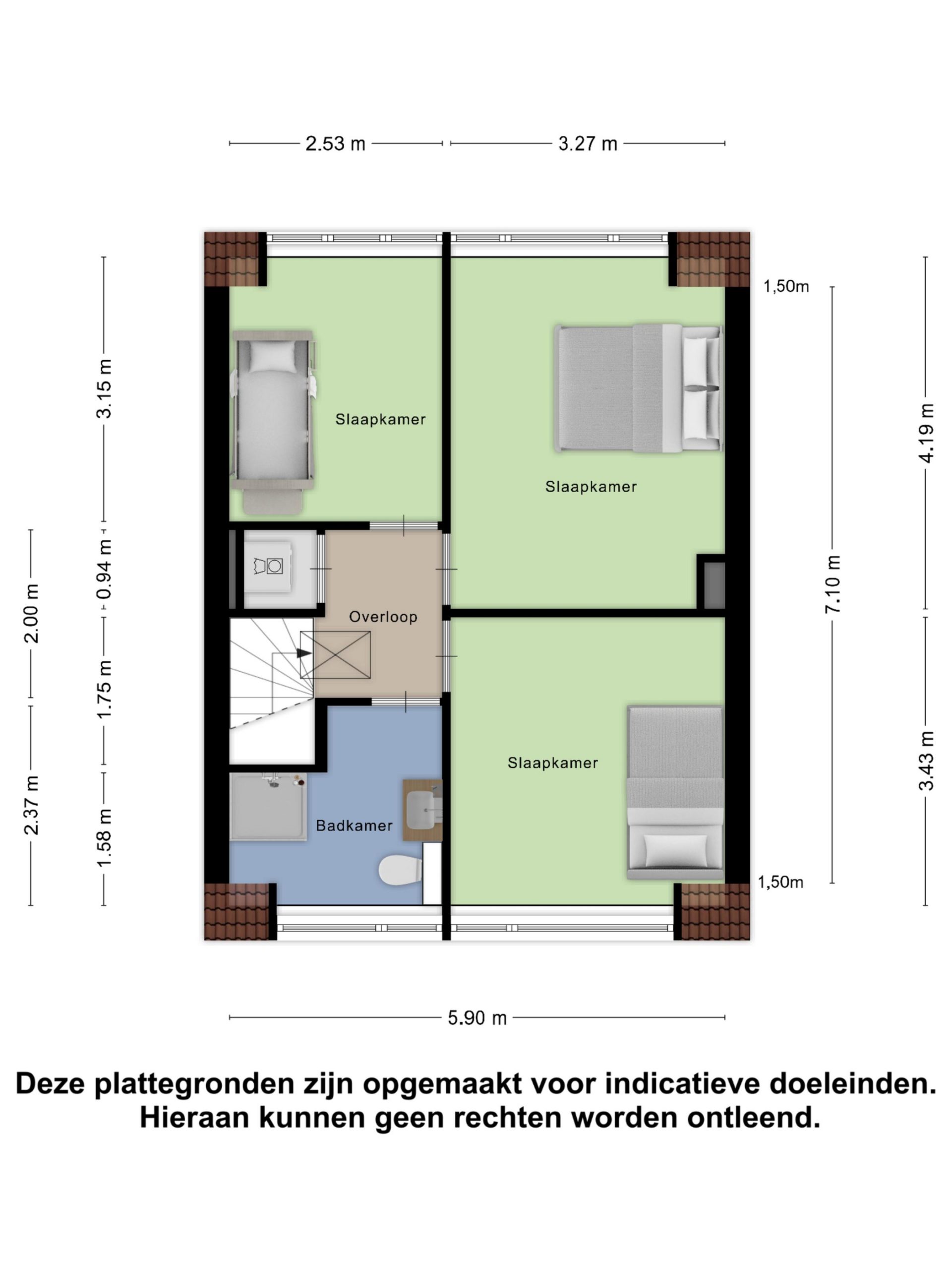 Overloop met PVC vloer, stucwerk wandafwerking en luik naar de bergvliering. Bergkast met daarin de aansluitingen voor de wasapparatuur. Slaapkamer 1 aan de achterzijde met PVC vloer, stucwerk wanden en dakkapel. Slaapkamer 2 aan de achterzijde met PVC vloer, stucwerk wanden en dakkapel. Slaapkamer 3 aan de voorzijde met PVC vloer, stucwerk wanden en dakkapel.