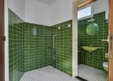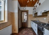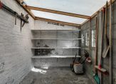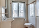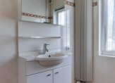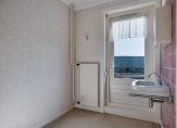 Praktische bijkeuken met tegelvloer en deur met rolluik naar de achtertuin. Hier bevinden zich de aansluitingen voor de wasapparatuur. Badkamer met toilet, wastafel en zitbad.
