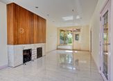– Gezellige woonkamer (oppervlakte: circa 27 m²) met verwarmde tegelvloer, stucwerk wandafwerking, open haard, inbouwspots en deur naar de zonnige achtertuin, originele tussendeuren met glas-in-lood ramen naar de hal en keuken.