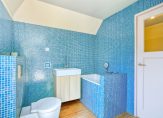 – geheel betegelde, 2e badkamer met bad, hangcloset, wastafel in meubel en een deur naar het platte dak.