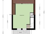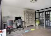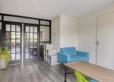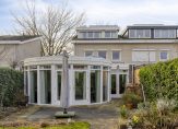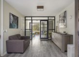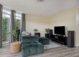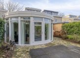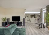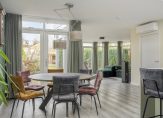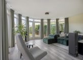 Zit-/tuinkamer aan de achterzijde met veel ramen, openslaande tuindeuren naar de achtertuin, inbouwspots, PVC vloer met vloerverwarming en stucwerk wandafwerking.