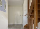 Entree met PVC vloer, stucwerk wandafwerking en garderobe nis. Meterkast met 10 groepen, 3 aardlekschakelaars en glasvezelaansluiting. Deels betegeld toilet met hang closet, fonteintje en afzuiging. Woonkamer met PVC vloer met vloerverwarming, stucwerk wandafwerking. Middels een fraai houten kozijn met 2 openslaande deuren is het voorste gedeelte van de woonkamer gescheiden. Deze flinke ruimte is op dit moment in gebruik als speelkamer en kantoor. Hier bevindt zich de praktische trapkast.