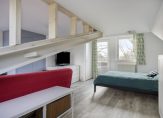 Overloop met PVC vloer. Zeer ruime slaapkamer 4 met PVC vloer, stucwerk wandafwerking, een balkon aan de voorzijde en een flinke dakkapel aan de achterzijde. Het balkon en de dakkapel zijn voorzien van elektrische rolluiken. Aan de achterzijde bevinden zich bergkasten over de volledige breedte. Inbouwkast met locatie CV ketel (Remeha, bouwjaar 2025).