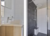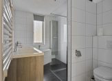 Moderne, volledig betegelde badkamer (2014) aan de voorzijde met dubbele wastafel met meubel, hangcloset, ligbad, inloopdouche, wandmeubel, decorradiator en afzuiging.