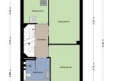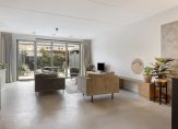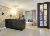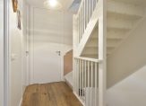 De woonkamer is voorzien van een gietvloer, deels stucwerk en deels behang wandafwerking en een fraaie harmonica deur naar de achtertuin. Praktische trapkast met daarin o.a. de warmtepomp en de boiler. Fraaie, open nis onder de trap. De WKO installatie is geen eigendom, hiervoor dient maandelijkse een huur betaald te worden € 77,= per maand, dit is inclusief service/onderhoud.