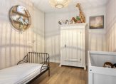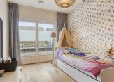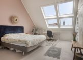 Flinke 4e slaapkamer met gietvloer, deels stucwerk en deels behang wandafwerking, 4 Velux dakramen aan de voorzijde en bergkasten onder het schuine gedeelte. Afsluitbare berg vide/kast boven de trapopgang.