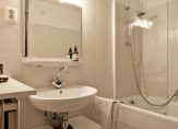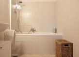 Deels betegelde badkamer met ligbad met douche gelegenheid en wastafel. In 2013 is de badkamer opnieuw betegeld. De aansluitingen voor de wasapparatuur bevinden zich in de badkamer.