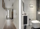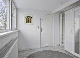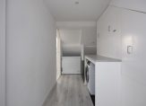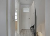 Entree met houten vloer, stucwerk wandafwerking en trapopgang naar de 1e verdieping. Meterkast 10 groepen en 3 aardlekschakelaars. Praktische trap/kelder kast: ideaal voor het opbergen van bijvoorbeeld uw provisie. Modern, volledig betegeld toilet met hangcloset, wastafel met meubel en ventilatie.
