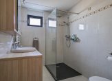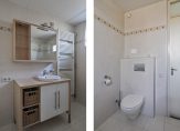 Volledig betegelde badkamer aan de achterzijde met inloopdouche, hangcloset, decorradiator en wastafel met meubel.