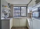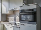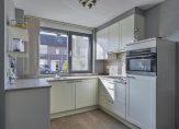 Keuken aan de voorzijde met tegelvloer met vloerverwarming. De U-vormige keukenopstelling is in 2013 vernieuwd en voorzien van verschillende inbouwapparatuur; 4-pits gasfornuis, afzuigkap, combi oven/magnetron, koelkast, vaatwasser (2020) en verschillende inbouwkastjes en lades.