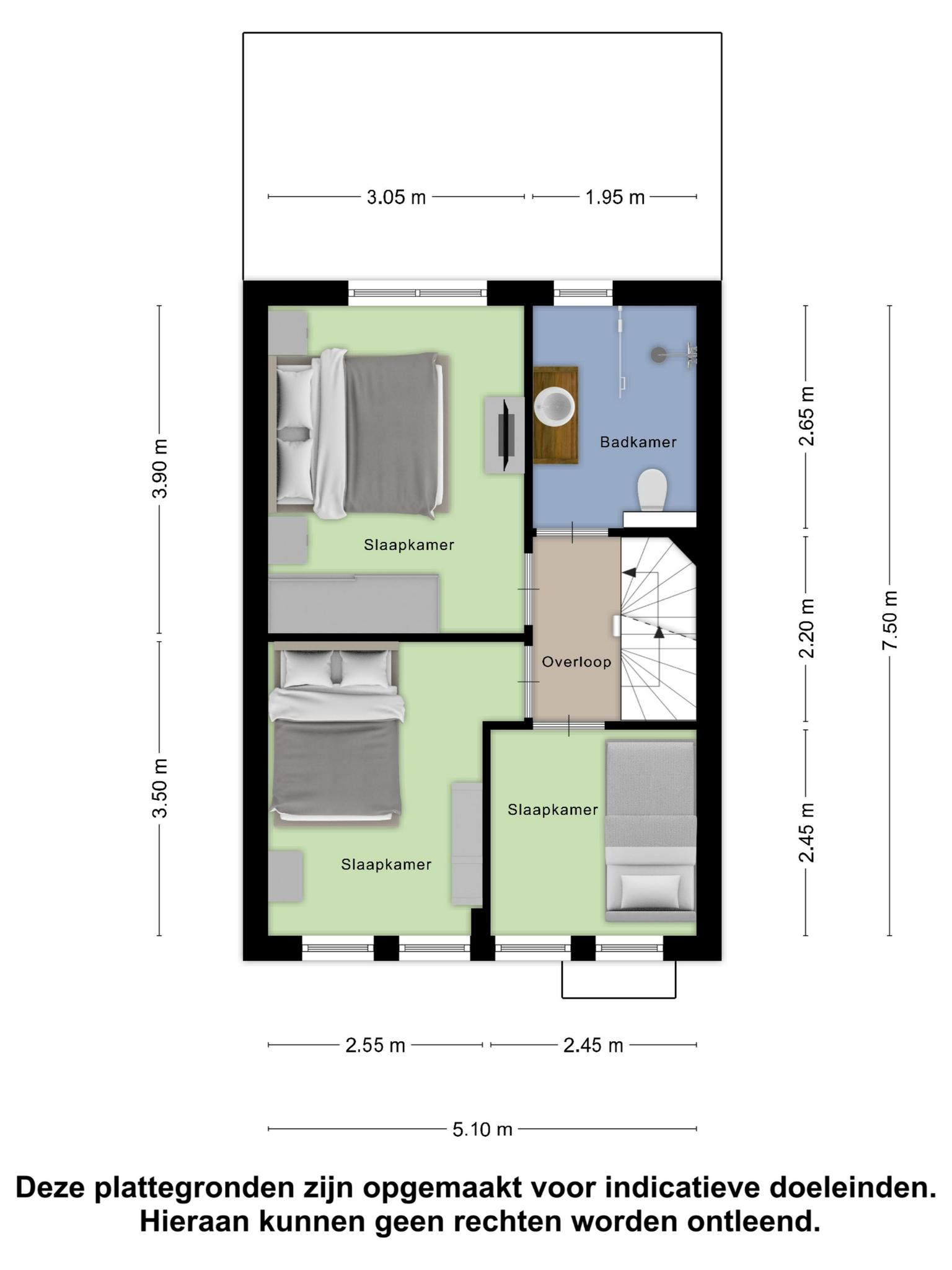 Overloop met laminaatvloer en stucwerk wandafwerking. Slaapkamer 1 aan de achterzijde met laminaatvloer, stucwerk wandafwerking en elektrisch rolluik. Slaapkamer 2 aan de voorzijde met laminaatvloer, stucwerk wandafwerking en elektrisch rolluik. Slaapkamer 3 aan de voorzijde met laminaatvloer, stucwerk wandafwerking en elektrisch rolluik.