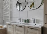 Overloop met laminaatvloer en stucwerk wandafwerking. Slaapkamer 1 aan de voorzijde (voorheen 2 kamers) met laminaatvloer en inloopkast. Slaapkamer 2 aan achterzijde met laminaatvloer en een rolluik. Moderne, volledig betegelde badkamer (2015) aan de achterzijde met ligbad, douche, dubbele wastafel met meubel, hangcloset, design radiator, rolluik en ventilatie.
