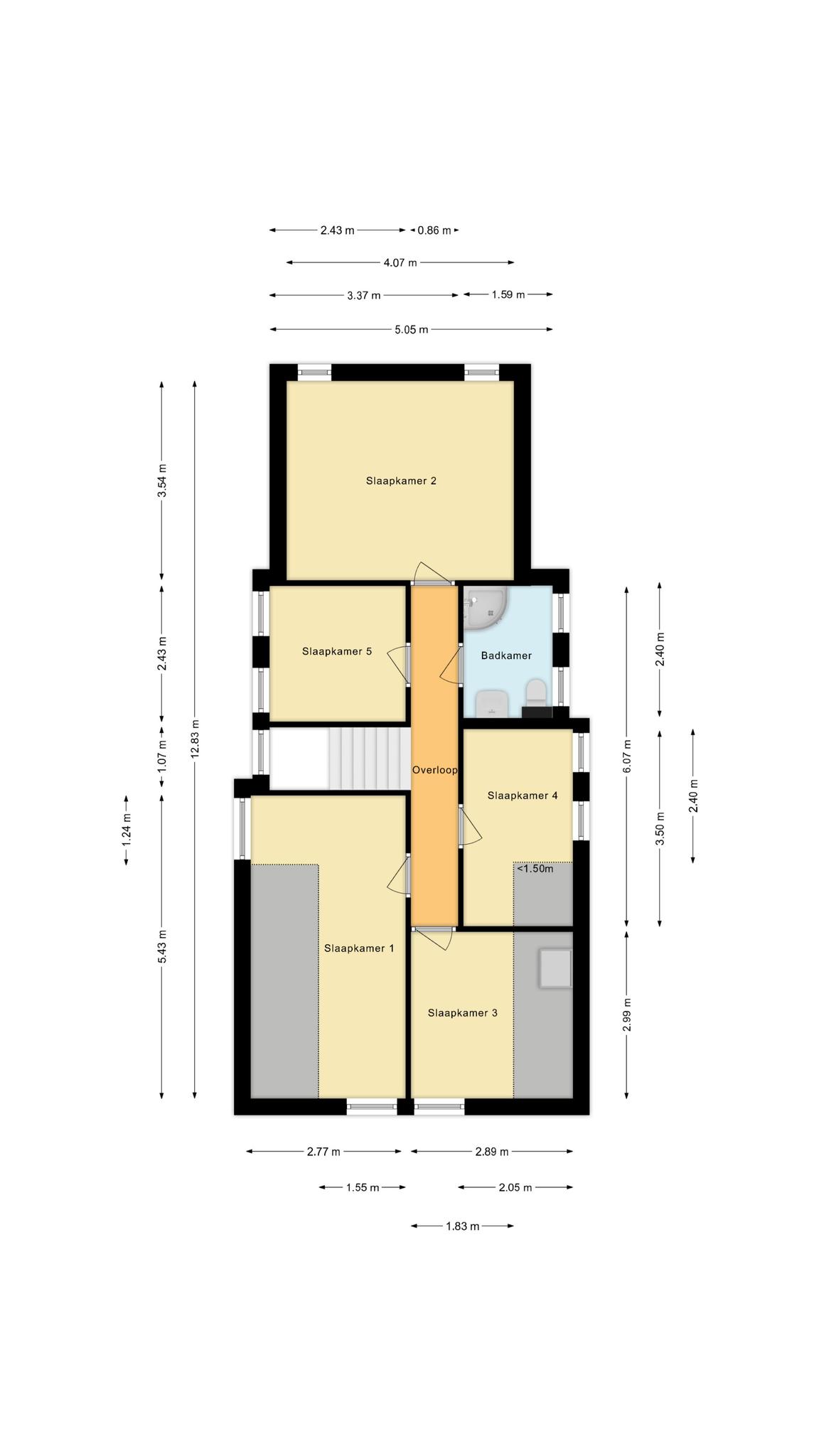 Op de verdieping de overloop, 5 slaapkamers en een badkamer met douche, wastafelmeubel en 2e toilet.