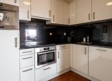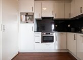 De half open keuken is voorzien van een moderne inbouwkeuken in hoekopstelling, welke de beschikking heeft over de navolgende inbouwapparatuur: 4-pits elektrische kookplaat, RVS afzuigkap, koelkast, combi-/magnetronoven en een vaatwasser. In het aanrechtblad verwerkt een enkele rvs spoelbak.