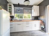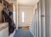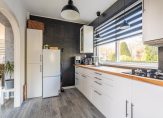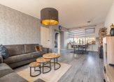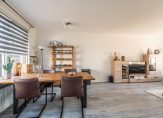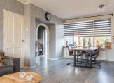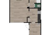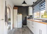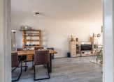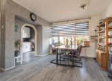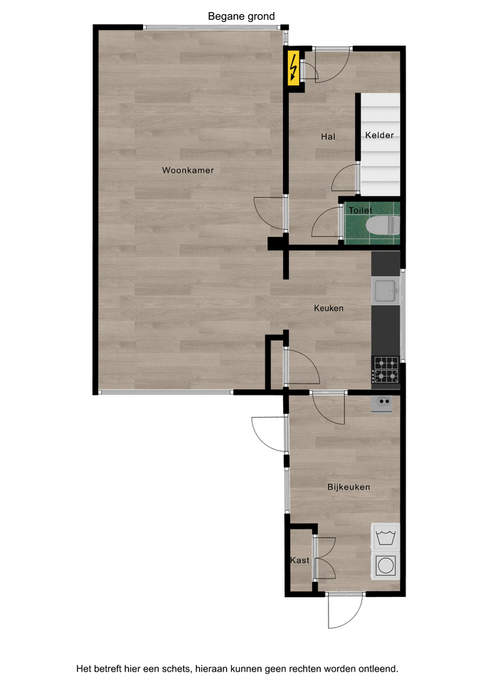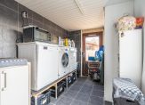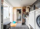 Indeling: entree/hal, modern betegeld toilet, kelder, woonkamer met laminaat ca. 745×380, half-open keuken met inbouwapparatuur, vaste kast en laminaat, ca. 300×240, ruime bijkeuken v.v. plavuizen 400×240.