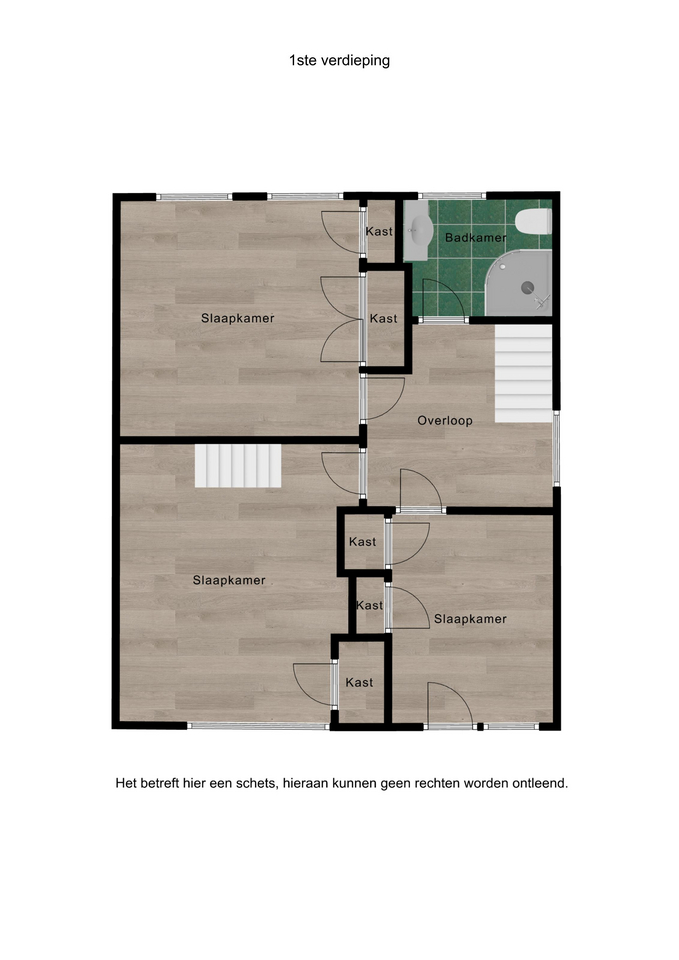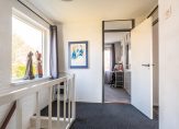 1e verdieping: lichte overloop, 3 slaapkamers ca. 400×300, 320×240 en 350×344 waarvan 2 met vaste kasten, badkamer met douchecabine, wastafelmeubel en 2e toilet.