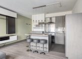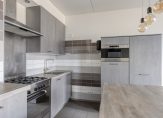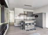 – De open keuken is uitgevoerd in een praktische opstelling en beschikt over een gezellige eetbar, ideaal voor ontbijt. De keuken is uitgerust met een kooktoestel met oven en zes-pits gasfornuis, afzuigkap, koelkast met vriesvak, combimagnetron en een ruime hoeveelheid kastruimte.
