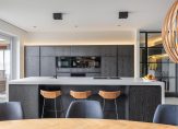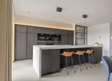 – Zeer ruime living (oppervlakte: inclusief open keuken: circa 67 m²) met een verwarmde gietvloer, hoge plinten en fraai stucwerk. Verder beschikt deze ruimte over fraai interieurtimmerwerk. Veel bergruimte in de op maat gemaakte wandkast en het dressoir. Ook treft u hier de bedieningspanelen aan van het videofoonsysteem en het geavanceerde domoticasysteem. De entree van de kamer met een prachtige stalen pui is werkelijk een eyecatcher. Een schuifpui aan de ene zijde en openslaande deuren aan de andere zijde geven toegang tot beide dakterrassen.