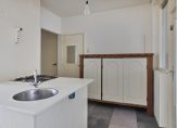 – Open keuken met een verdiepte kelderkast met groepenkast en een eenvoudige keukeninrichting met RVS spoelbak en een gaskookplaat.