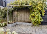 Voortuin met bestrating en stenen berging. De berging is voorzien van elektra. Flinke, verzorgde achtertuin op het oosten. De achtertuin is voorzien van een overdekt terras, een vlonder (terras), gazon, borders met vaste beplanting, verschillende elektra punten en een achterom. De achterom is vrij gelegen en komt uit op een straat met parkeerplaatsen. Houten berging.