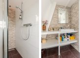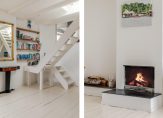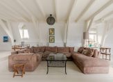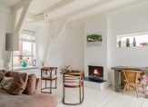Een lichte, bijzonder ruime woonkamer met speelse indeling en een prachtige kapconstructie. De open haard zorgt voor een warme sfeer, en dankzij de open indeling sluiten het zit-, eet- en werkgedeelte perfect op elkaar aan.