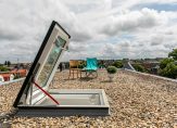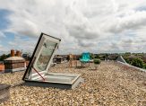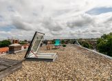 Een vaste trap leidt naar het platte dak. Hier zijn mogelijkheden om een dakterras te realiseren (vergunning vereist), waarmee je een eigen buitenruimte kunt creëren midden in de stad.