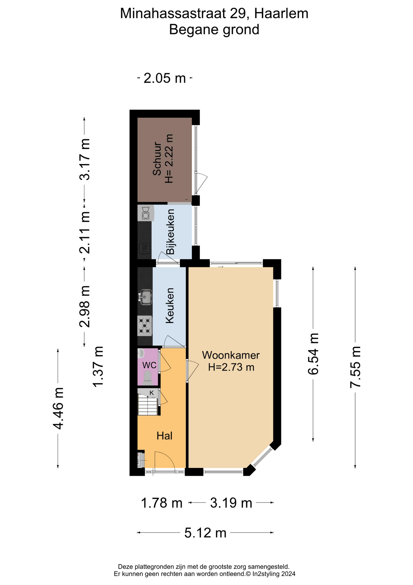 hal, meterkast, toilet met fontein, heerlijke woonkamer met veel lichtinval en schuifpui naar de knusse achtertuin met achterom, moderne keuken voorzien van diverse inbouwapparatuur, toegang tot de bijkeuken schuur met opstelling voor wasmachine en droger en doorloop naar de schuur.