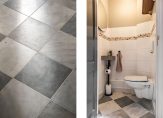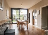 De entree is afgewerkt met een elegante granito vloer, wat direct een gevoel van luxe en verfijning geeft. Bij binnenkomst valt vervolgens de ruime en lichte woonkamer op, voorzien van een prachtige houten visgraatvloer en een uitnodigende erker aan de voorzijde. De grote, van vloer tot plafond reikende schuifdeuren bieden een naadloze overgang naar de achtertuin en laten volop daglicht binnenstromen.
