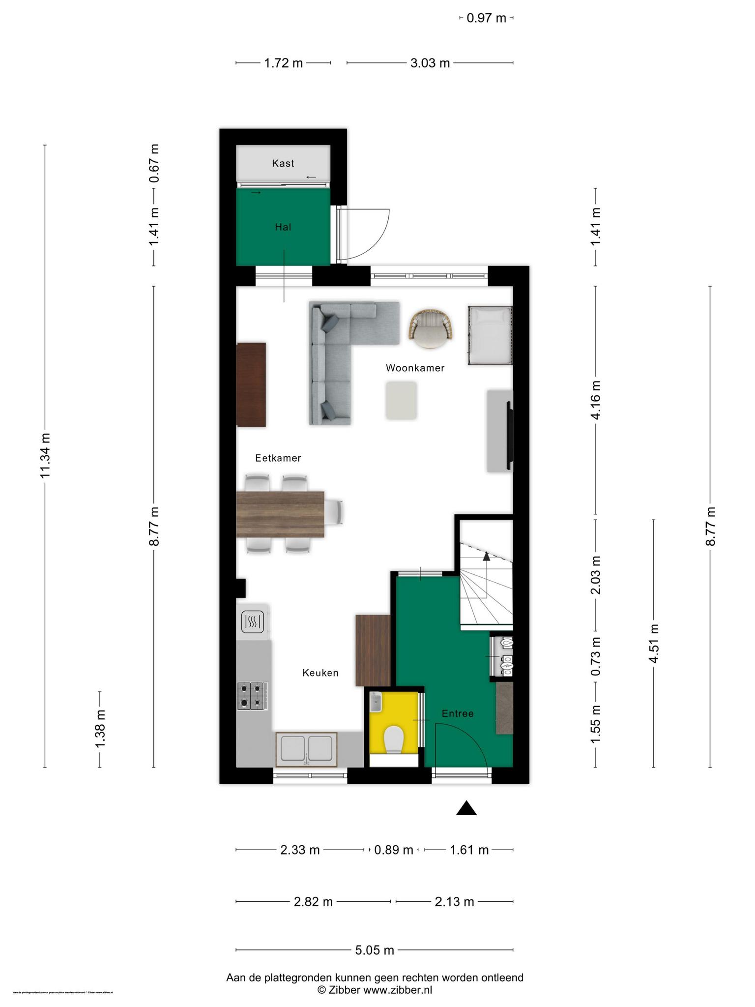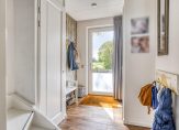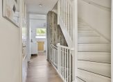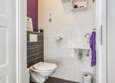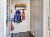 Het huis met de luifel boven de deur… daar moet je zijn! Door het raam in de voordeur kijk je naar de lichte hal, met de trap naar de eerste verdieping. Aan de rechterzijde, naast de meterkast, is ruimte voor een kapstok en een schoenenrek. De toiletruimte, met een wandcloset en fonteintje, is vanuit de hal te bereiken.