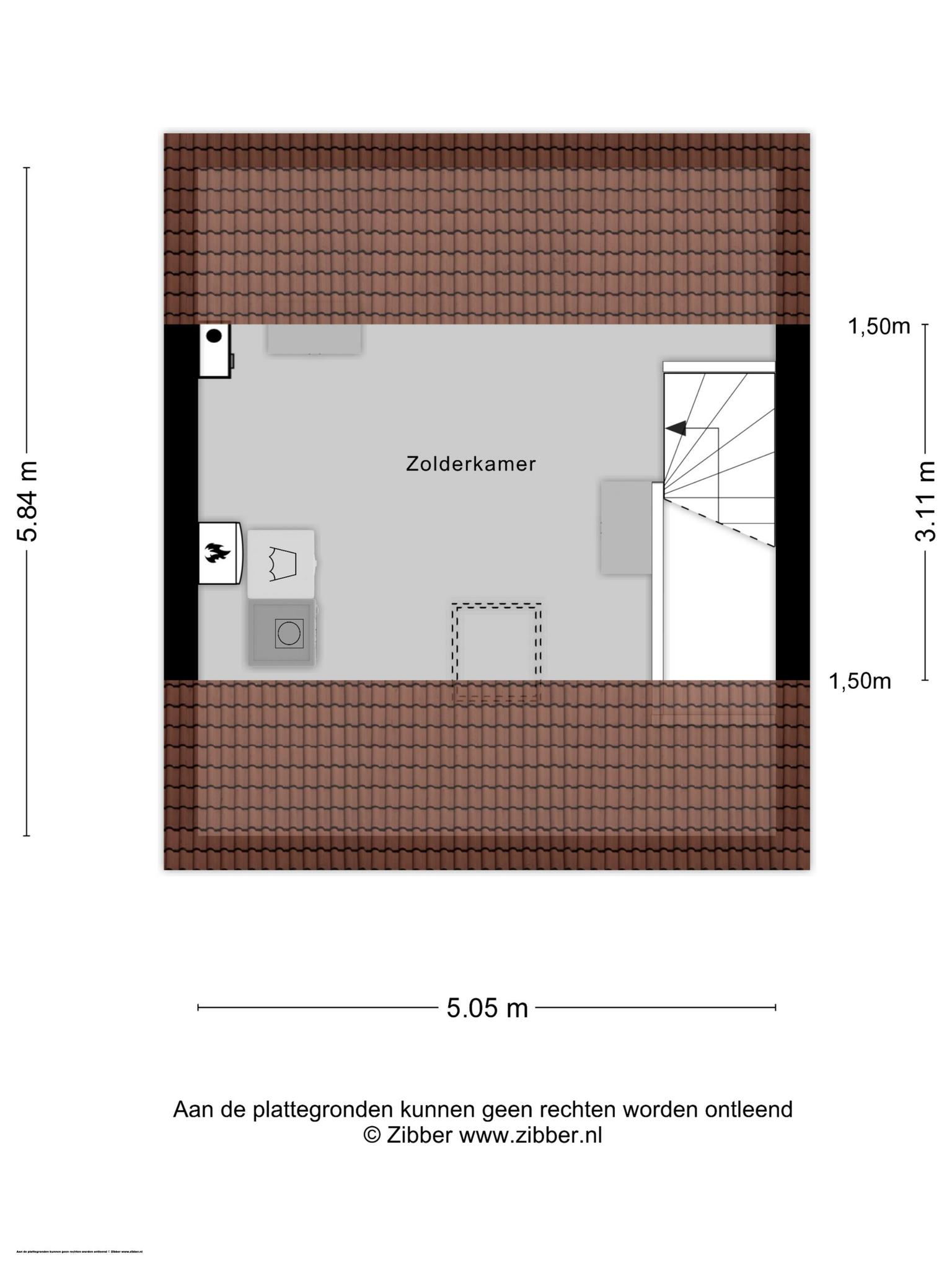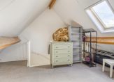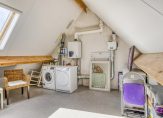 Een vaste trap geeft toegang tot de zolderkamer, met een dakraam en een hoge nok. Bij de verwarmingsinstallatie is de opstelling van de HR-ketel. De rest van deze kamer is nu als berging in gebruik.