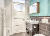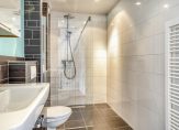 Ook aan de badkamer hoef je niks te doen. Grote wand- en vloertegels, in wit en grijs, zijn gecombineerd met mooi sanitair. De ruimte is ingedeeld met een inloopdouche, wandcloset en een wastafel met spiegel.