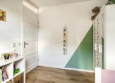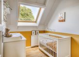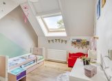 Ook op de eerste verdieping is dit een fijn huis, met paneeldeuren en laminaat op de vloer. We tellen drie slaapkamers, waarvan twee aan de achterzijde. Beide kamers hebben een groot raam in het steile, schuine dakvlak.