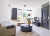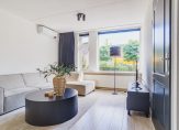 De lichte en ruime woonkamer heeft een oppervlakte van circa 20 m² en is afgewerkt met een nette laminaatvloer. Er is voldoende plek voor een comfortabele zithoek. Vanuit de woonkamer bereikt u direct de keuken en het achter portaal, die op haar beurt toegang geeft tot het toilet en de achtertuin.