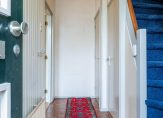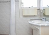 1e Verdieping: overloop – vaste kast met wasmachine-aansluiting – drie slaapkamers, waarvan één met inbouwkasten – badkamer met douche en wastafel.