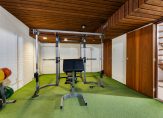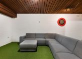 Kelder: hal – kasten – grote open chill/ sport/ werkruimte – provisieruimte – stookruimte en ruimte met wasmachine-aansluiting en keukenblok.