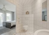Via de entree komt u in de ruime hal met trapopgang, meterkast en toilet. Direct rechts bevindt zich een royale slaapkamer en een moderne badkamer en suite voorzien van ligbad, dubbele wastafel, toilet, vloerverwarming en inloopdouche.