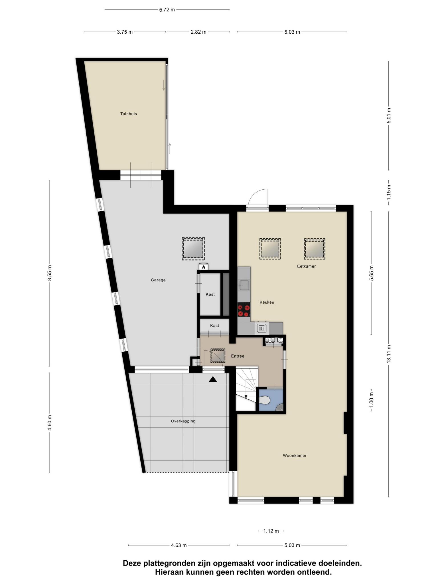 De entree bevindt zich aan de voorzijde van de woning waarna u de hal betreedt. In de hal bevindt zich het toilet met inbouwreservoir en wastafel, deur naar de garage, de trapopgang naar de eerste verdieping, meterkast met krachtstroom (9 groepen en 2 aardlekschakelaars en glasvezelaansluiting) en toegang tot de ruime woonkamer.