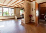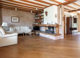 De royale woonkamer van maar liefst 44 m² is zowel straat- als tuingericht, speels ingedeeld en afgewerkt met een massieve eiken parketvloer in een lichte tint. De sfeervolle schouw met gashaard zorgt voor warmte én gezelligheid tijdens de wintermaanden.