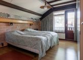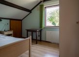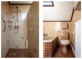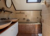 De badkamer is functioneel ingericht en beschikt over een ligbad, inloopdouche, toilet en twee wastafels. Hoewel het sanitair eenvoudig en enigszins gedateerd is, biedt de ruimte volop mogelijkheden voor modernisering naar eigen wens. Natuurlijke ventilatie is aanwezig via een dakvenster.